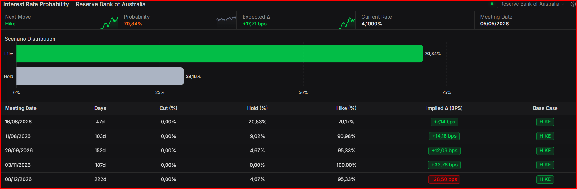 Thị trường tiền tệ đang định giá khả năng 70% Ngân hàng Dự trữ Australia (RBA) sẽ tăng lãi suất lên 4,35% tại cuộc họp ngày 5 tháng 5, theo dữ liệu từ Prime Terminal.