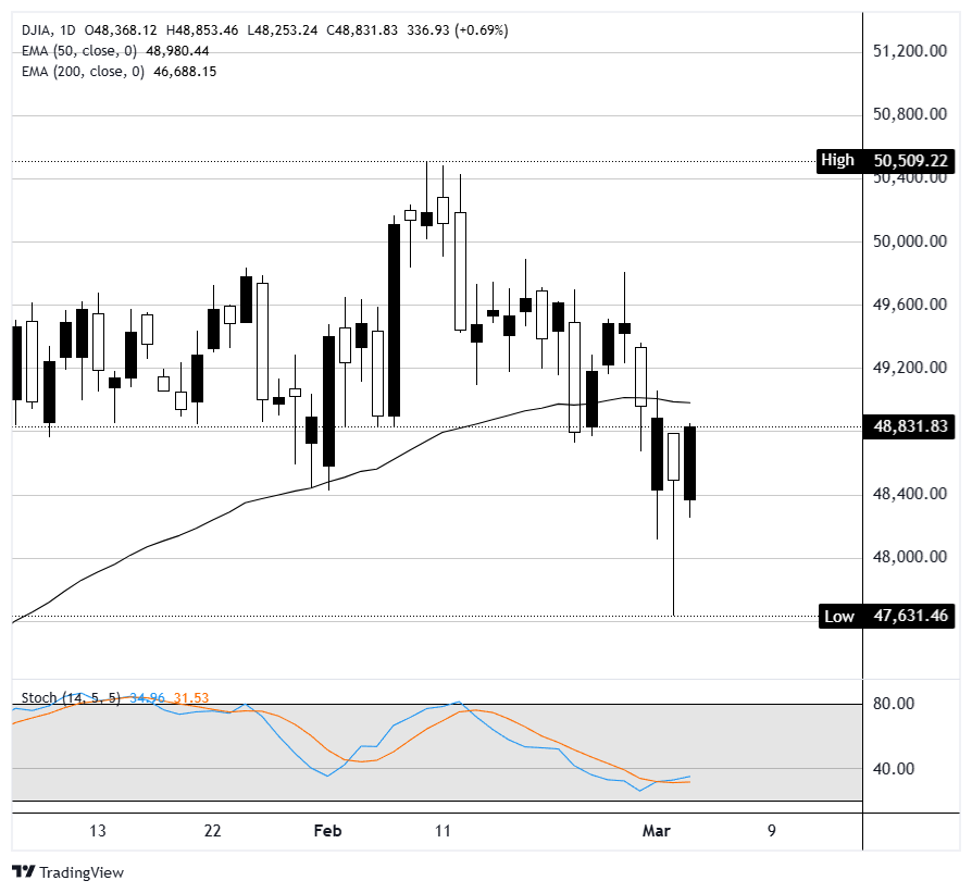 Chỉ số công nghiệp trung bình Dow Jones giao dịch cao hơn 312 điểm, tương đương 0,65%, ở mức 48.807 tại thời điểm viết bài vào thứ Tư, lấy lại hầu hết các khoản lỗ của thứ Ba sau một phiên giao dịch mà chỉ số đã giảm tới 1,2K điểm trong ngày trước khi đóng cửa giảm 403 điểm. Chỉ số mở cửa ở mức 48.368 và đạt mức cao nhất trong ngày là 48.853, mặc dù vẫn dưới mức trung bình động hàm mũ 50 ngày ở mức 48.979. Chỉ số S&P 500 tăng 0,87% lên 6.875, trong khi Nasdaq Composite dẫn đầu với mức tăng 1,47% lên 22.847. Sự kết hợp giữa dữ liệu kinh tế tốt hơn mong đợi và giá dầu giảm đã mang lại lý do cho các nhà đầu tư mua vào khi giá giảm, ngay cả khi cuộc xung đột Mỹ-Iran tiếp tục chiếm ưu thế trên các tiêu đề.