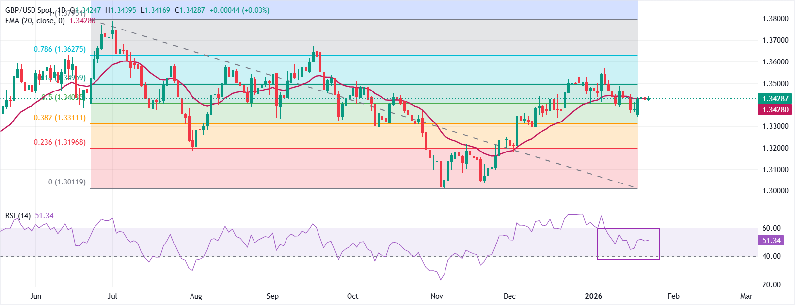 GBP/USD giao dịch ổn định gần 1,3430 tại thời điểm viết bài. Đường trung bình động hàm mũ (EMA) 20 ngày đã phẳng sau một đợt tăng ổn định, báo hiệu sự tích luỹ quanh mức trung bình ngắn hạn.
