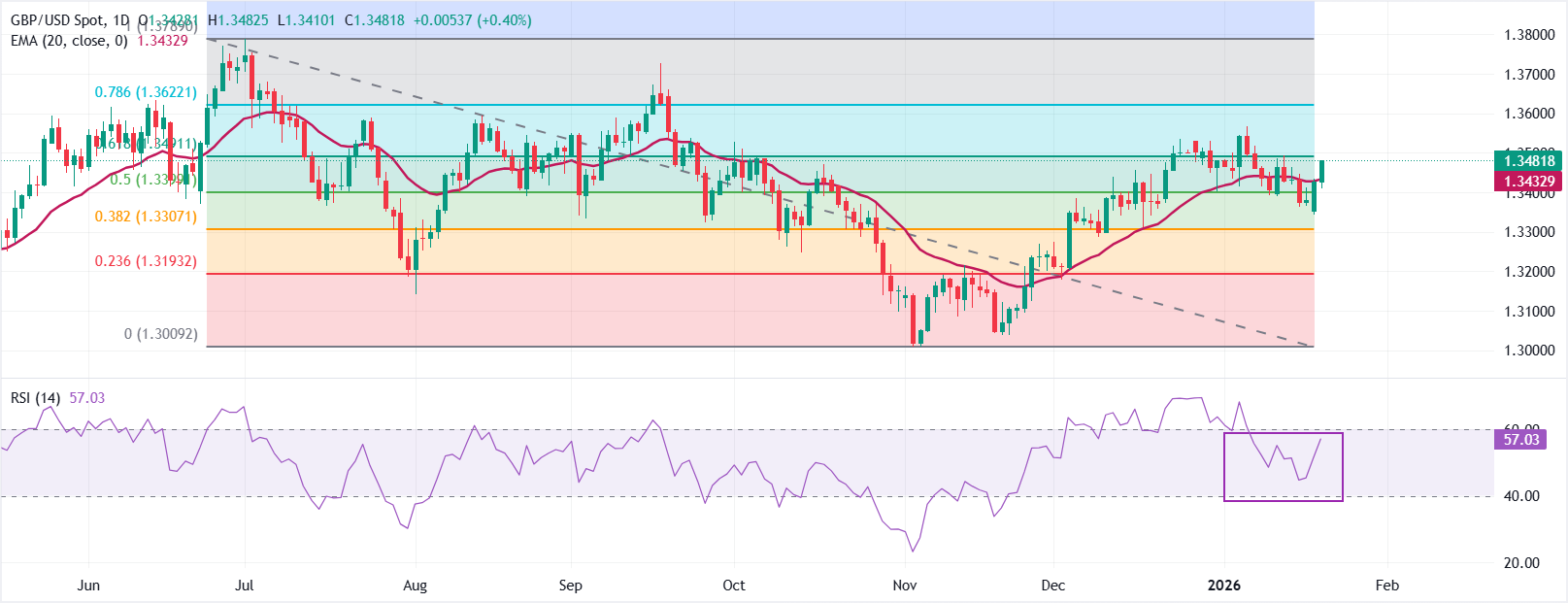 GBP/USD tăng lên gần 1,3480 tại thời điểm viết bài. Giá giữ trên Đường trung bình động hàm mũ (EMA) 20 ngày ở mức 1,3433, giữ cho xu hướng ngắn hạn được hỗ trợ. Đường EMA 20 ngày đã phẳng, cho thấy sự củng cố sau đợt tăng trước đó.