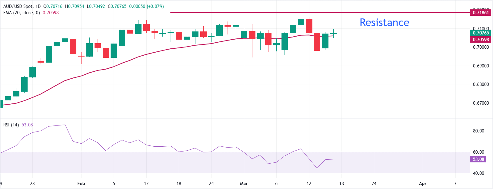 Kháng cự ban đầu xuất hiện ở khoảng 0,7100 ngay dưới mức kháng cự 0,7120–0,7150 của tuần trước. Việc đóng cửa hàng ngày trên vùng này sẽ mở lại con đường hướng tới mức giữa 0,72, tiếp theo là 0,7300. Về phía giảm, mức thấp ngày 3 tháng 3 là 0,6944 là mức hỗ trợ đầu tiên, tiếp theo là mức thấp ngày 6 tháng 2 quanh mức 0,6900. Một động thái giảm bền vững dưới mức này sẽ làm tăng khả năng xảy ra một giai đoạn điều chỉnh sâu hơn hướng tới vùng 0,6770-0,6800.