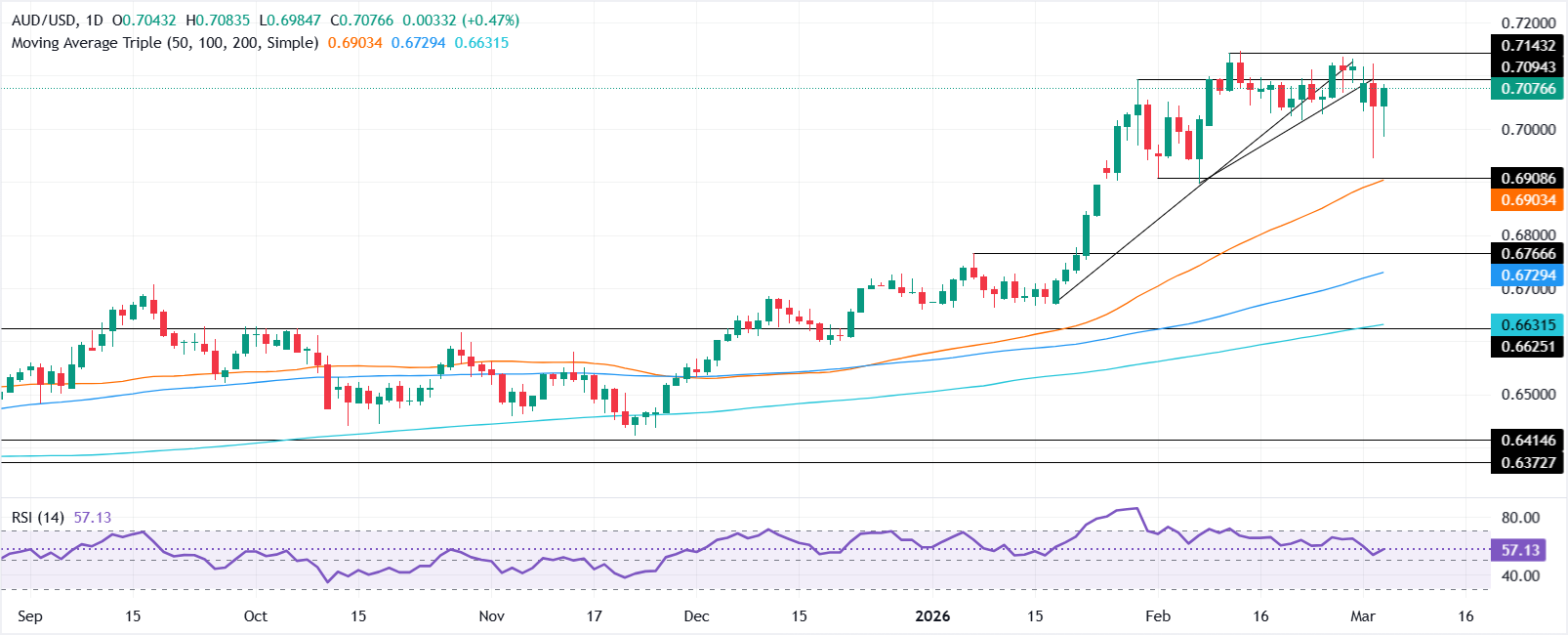 Hình ảnh kỹ thuật của AUD/USD vẫn nghiêng về xu hướng tăng sau khi giảm gần 1% vào thứ Ba, đẩy đồng đô la Úc xuống mức thấp nhất trong bốn tuần ở mức 0,6944. Mặc dù vậy, đà tăng có vẻ tích cực như được thể hiện bởi Chỉ báo Sức mạnh Tương đối (RSI) với chỉ số nằm trên mức trung lập 50 và đang hướng tới mức cao hơn.