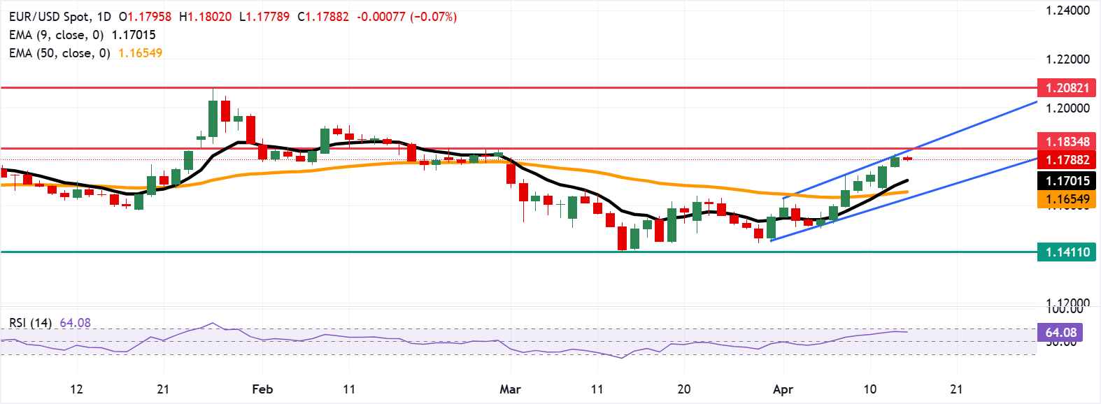 EUR/USD giữ trạng thái ổn định sau khi chấm dứt chuỗi bảy ngày tăng liên tiếp, giao dịch quanh mức 1,1790 trong giờ châu Á vào thứ Tư. Phân tích kỹ thuật trên biểu đồ hàng ngày cho thấy xu hướng tăng giá, khi cặp tiền này đang di chuyển lên trong một kênh tăng dần.