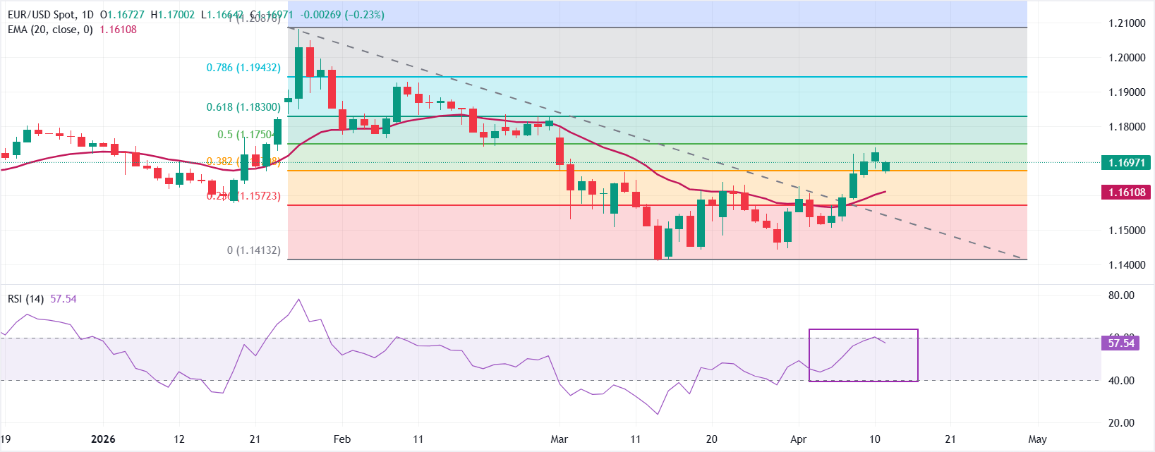 EUR/USD giao dịch thấp hơn quanh mức 1,1700 tại thời điểm viết bài. Cặp tiền giữ xu hướng tăng giá tích cực khi giao dịch trên đường trung bình động hàm mũ 20 ngày (EMA) tại 1,1611 và mức thoái lui Fibonacci 38,2% tại 1,1671 như mức hỗ trợ gần kề. Chỉ số sức mạnh tương đối (RSI) (14) ở mức 57,6 nằm trên đường trung lập 50, cho thấy động lực tăng đang được xây dựng trong khi vẫn chưa vào vùng quá mua.