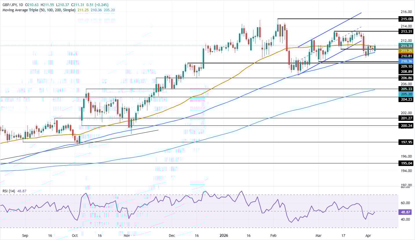 Bức tranh kỹ thuật cho thấy GBP/JPY dự kiến sẽ duy trì đi ngang trừ khi phe đầu cơ giá lên vượt qua mức tâm lý 211,50, được xem là mức kháng cự then chốt trước khi mở đường thử thách các mức giá cao hơn. Cặp tiền này đã kiểm tra mức vừa nêu, và việc phá vỡ mức này sẽ mở đường cho thử thách Đường SMA 20 ngày tại 211,90, trước khi hướng tới 212,00. Nếu tiếp tục tăng mạnh, người mua sẽ nhắm tới mức cao ngày 26 tháng 3 tại 213,31, trước khi hướng tới 214,00.