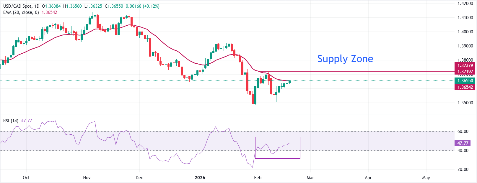 USD/CAD giao dịch cao hơn một chút ở mức khoảng 1,3655 tại thời điểm báo chí. Cặp tiền này nằm trên Đường trung bình động hàm mũ (EMA) 20 ngày ở mức 1,3654, đã phẳng sau một đợt giảm ổn định. Độ dốc giảm nhẹ làm giảm động lượng giảm và định hình đường trung bình như một điểm pivot ngắn hạn.