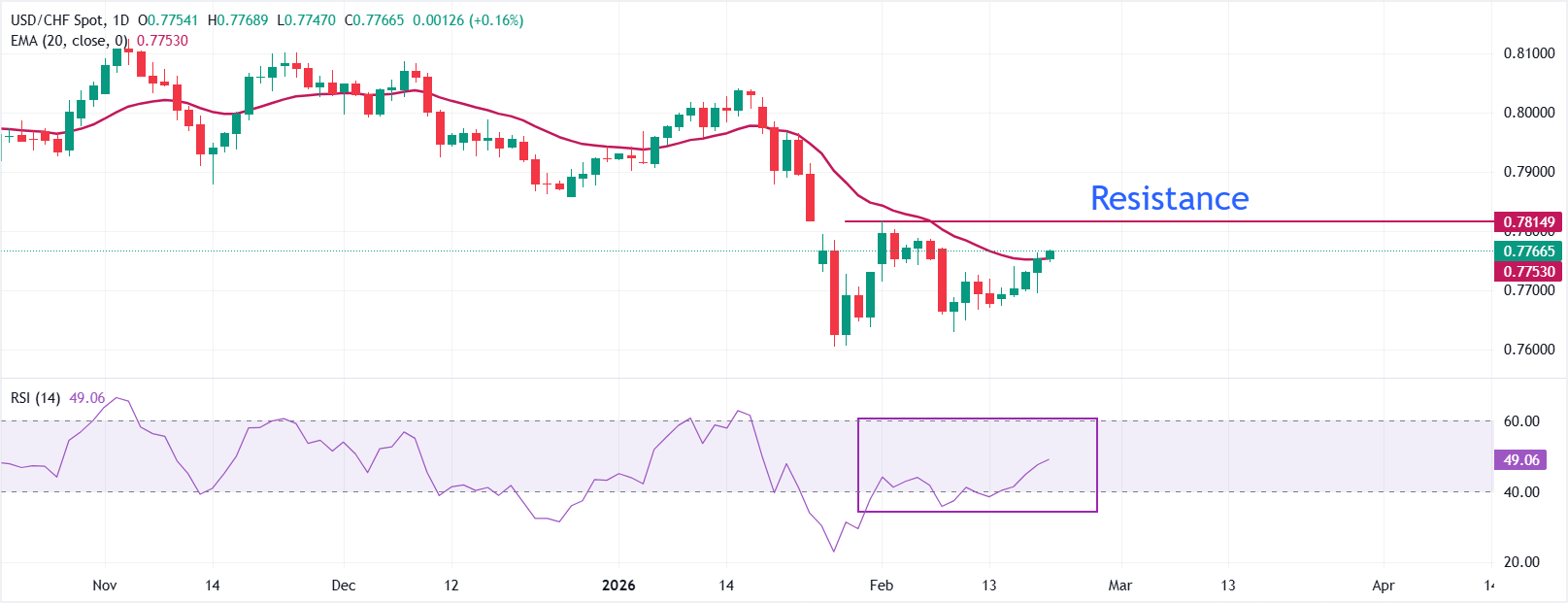 USD/CHF giao dịch cao hơn ở mức khoảng 0,7765 tại thời điểm viết bài. Giá ổn định ngay trên đường EMA 20 ngày ở mức 0,7753, và đường trung bình đã phẳng sau một đợt giảm kéo dài nhiều tuần. Độ dốc giảm dần cho thấy áp lực giảm giá đang suy yếu, mặc dù sự xác nhận xu hướng vẫn chưa có.