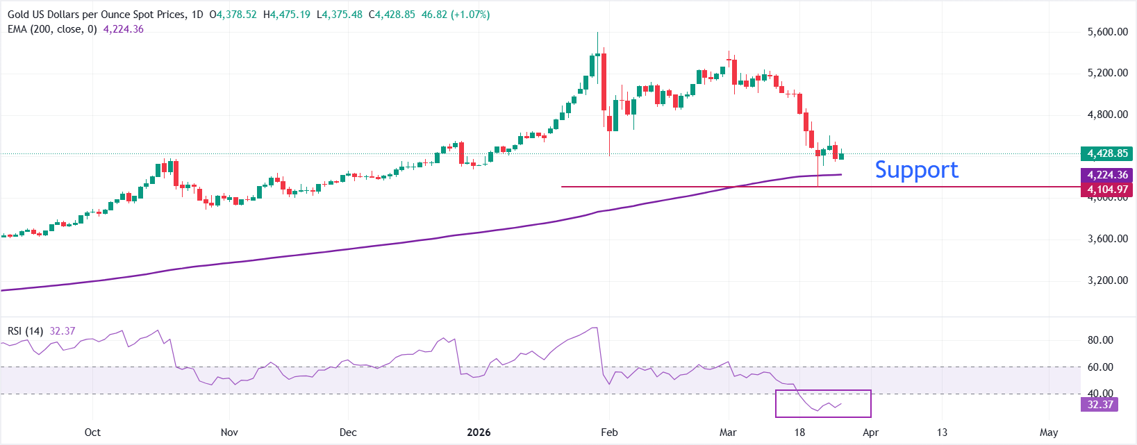 Mức kháng cự ngay lập tức nằm gần mức cao nhất ngày 25 tháng 3 quanh mức 4.600 đô la, tiếp theo là 4.820 đô la, là vùng phá vỡ gần đây nhất. Giá giao ngay sẽ tăng lên khoảng 5.000 đô la nếu vượt qua được mức 4.820 đô la. Ở chiều giảm, mức hỗ trợ ban đầu nằm ở đường EMA 200 ngày, khoảng 4.220 đô la, tiếp theo là mức thấp nhất ngày 23 tháng 3 khoảng 4.100 đô la.