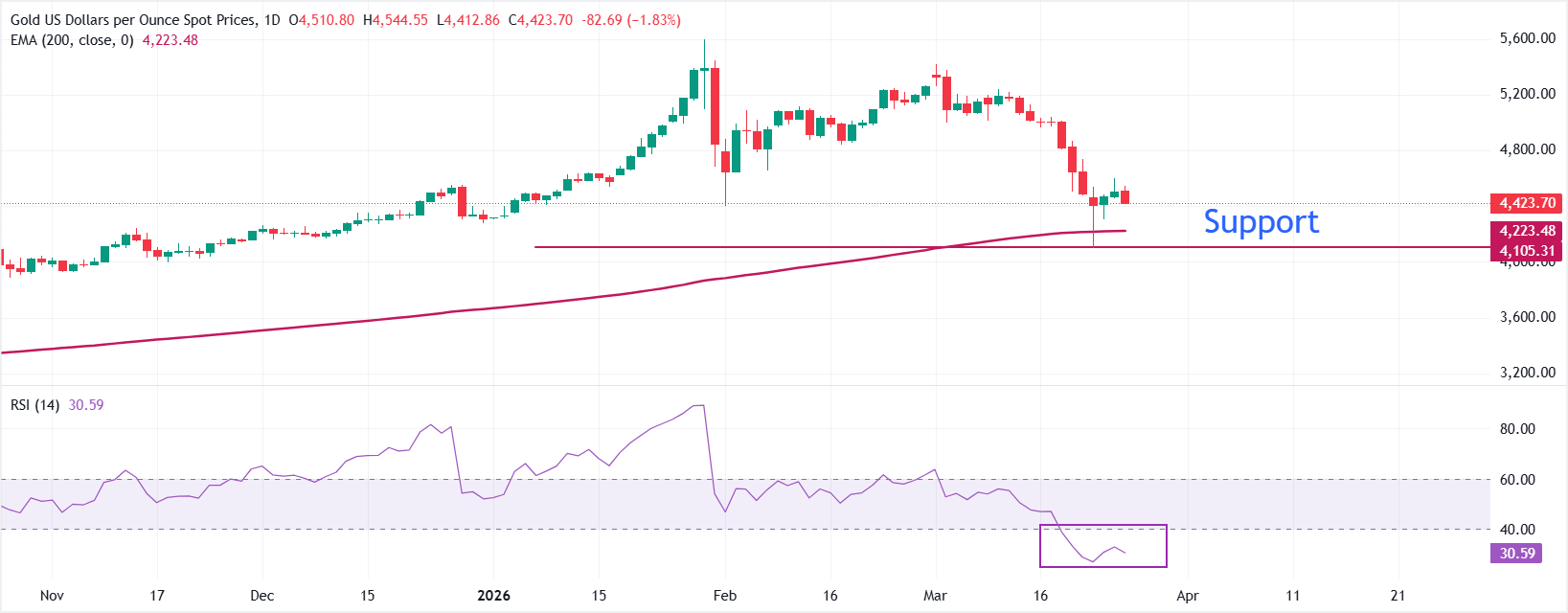 Mức hỗ trợ ban đầu xuất hiện ở khu vực 4.400 đô la, với việc đóng cửa hàng ngày dưới mức này sẽ cho thấy sự suy yếu sâu hơn hướng tới đường EMA 200 ngày ở mức 4.223 đô la và sau đó là mức thấp ngày 23 tháng 3 quanh mức 4.100 đô la.