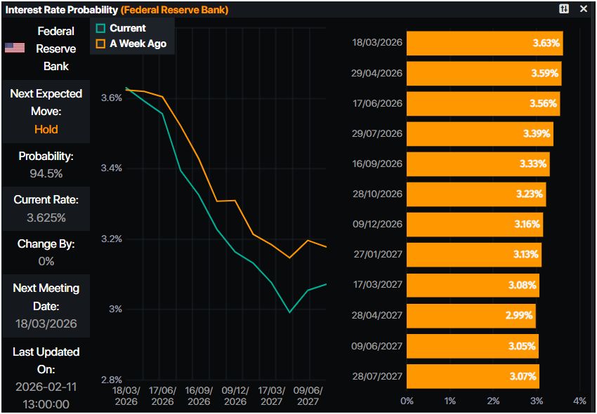 Thị trường tiền tệ ban đầu định giá khả năng cắt giảm lãi suất của Cục Dự trữ Liên bang (Fed) vào tháng 6 năm 2026 là 100%. Tại thời điểm viết bài, các nhà đầu tư đã giảm cược của họ, với tỷ lệ cược ở mức 68% cho ngày đó, trong khi cho tháng 3, có 95% khả năng giữ nguyên, theo dữ liệu từ Prime Market Terminal.