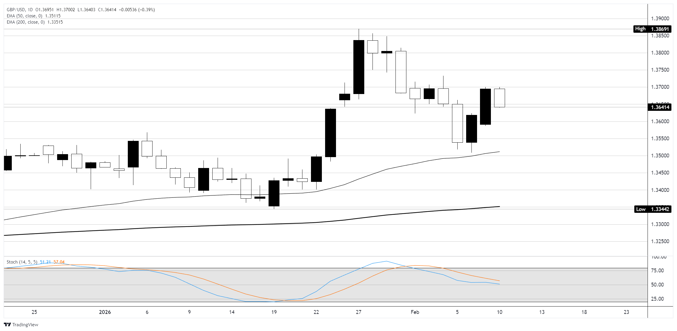 GBP/USD đã giảm trở lại vào thứ Ba sau đợt phục hồi mạnh mẽ hôm thứ Hai từ mức thấp 1.3510, đóng cửa ở mức 1.3641, giảm 0.39% trong phiên. Biểu đồ hàng ngày cho thấy cặp tỷ giá này đã mất đi những khoản lợi nhuận từ mức cao 1.3700, tạo ra một nến giảm giá cho thấy sự phục hồi từ mức thấp hai tuần hôm thứ Sáu đang mất đà gần mức thoái lui Fibonacci 50% của đợt giảm từ 1.3869 xuống 1.3510 (khoảng 1.3690). Cấu trúc tổng thể vẫn lạc quan, với giá giữ vững trên đường trung bình động lũy thừa 50 (EMA) ở mức 1.3512 và đường EMA 200 ở mức 1.3352, nhưng đợt bán tháo mạnh từ mức cao cuối tháng Giêng là 1.3869 đã tạo ra mô hình đỉnh thấp hơn, đe dọa xu hướng tăng. Chính sách nới lỏng tiền tệ của Ngân hàng trung ương Anh (BoE) sau khi giữ nguyên lãi suất ở mức 3,75% vào tuần trước (kết hợp với tỷ lệ 5-4), cùng với sự bất ổn chính trị ngày càng gia tăng ở Anh xoay quanh vai trò lãnh đạo của Thủ tướng Starmer, tiếp tục gây áp lực lên đồng Bảng Anh. Chỉ báo dao động ngẫu nhiên (14, 5, 5) ở mức 51,21/57,04, với chỉ báo %K cắt xuống dưới %D trong vùng trung lập, cho thấy đà giảm đang hướng đến phiên giao dịch ngày thứ Tư.