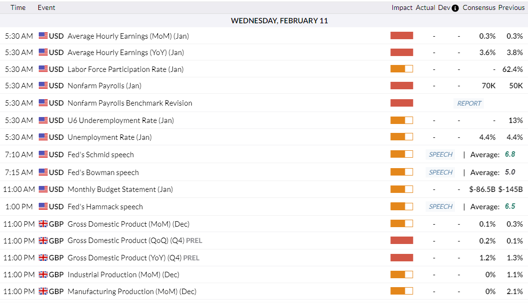 Ngày thứ Tư mang đến rủi ro kép cho cặp tiền tệ này khi cả hai bờ Đại Tây Dương đều công bố dữ liệu có tác động lớn. Báo cáo việc làm phi nông nghiệp (NFP) tháng Giêng bị trì hoãn từ Cục Thống kê Lao động (BLS) sẽ được công bố lúc 5:30 sáng, với dự báo đồng thuận là tăng 70.000 việc làm so với 50.000 việc làm của tháng 12, cùng với việc điều chỉnh chuẩn hàng năm, tỷ lệ thất nghiệp (dự báo 4,4%) và thu nhập trung bình theo giờ (dự báo tăng 0,3% so với tháng trước, tăng 3,6% so với cùng kỳ năm ngoái). Vào lúc 23:00, Anh sẽ công bố dữ liệu sơ bộ về Tổng sản phẩm quốc nội (GDP) quý 4 (dự báo 0,2% so với quý trước, so với 0,1% của quý trước), GDP tháng 12 (dự báo 0,1% so với tháng trước) và số liệu sản xuất công nghiệp và chế tạo tháng 12 (cả hai đều dự báo 0% so với tháng trước). Việc công bố chỉ số việc làm phi nông nghiệp (NFP) có khả năng định hình xu hướng đầu phiên; một con số yếu dưới 70.000 sẽ gây áp lực lên đồng đô la Mỹ và có thể đẩy GBP/USD trở lại vùng kháng cự 1,3700 đến 1,3727 (mức thoái lui Fibonacci 61,8%), trong khi một con số mạnh hơn có nguy cơ đẩy cặp tỷ giá này trở lại vùng hỗ trợ 1,3510 và đường EMA 50. Dữ liệu GDP của Anh được công bố sau đó trong phiên giao dịch sẽ trở thành chất xúc tác thứ hai; nếu không đạt được mức dự báo 0,2% so với quý trước, điều đó sẽ củng cố kỳ vọng về việc Ngân hàng trung ương Anh (BoE) cắt giảm lãi suất vào tháng 3 và có thể hạn chế bất kỳ đà tăng nào của GBP. Ba diễn giả của Cục Dự trữ Liên bang (Fed) (Schmid, Bowman, Hammack) cũng nằm trong lịch trình ngày thứ Tư, làm tăng thêm khả năng biến động mạnh trong ngày giữa mức 1.3510 và mức 1.3700.