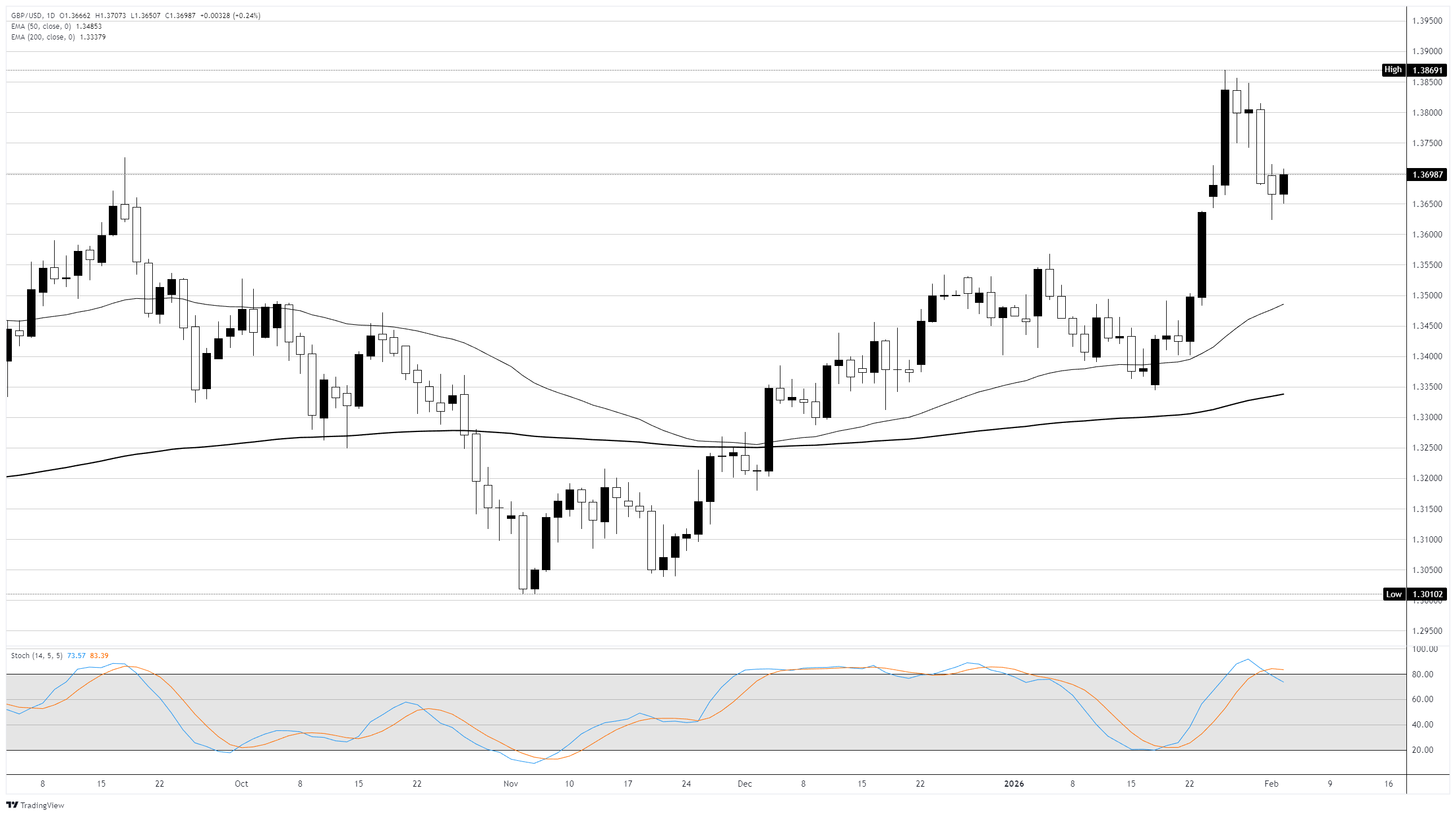 BP/USD tiếp tục giao dịch trong xu hướng tăng trên biểu đồ hàng ngày, với giá duy trì gần mức 1.3700 sau khi giảm từ mức cao nhất ngày 27 tháng 1 là 1.3869. Cặp tỷ giá này vẫn nằm trên cả đường trung bình động lũy thừa (EMA) 50 ngày ở mức 1.3485 và EMA 200 ngày ở mức 1.3338, duy trì xu hướng tăng rõ ràng trong trung hạn.