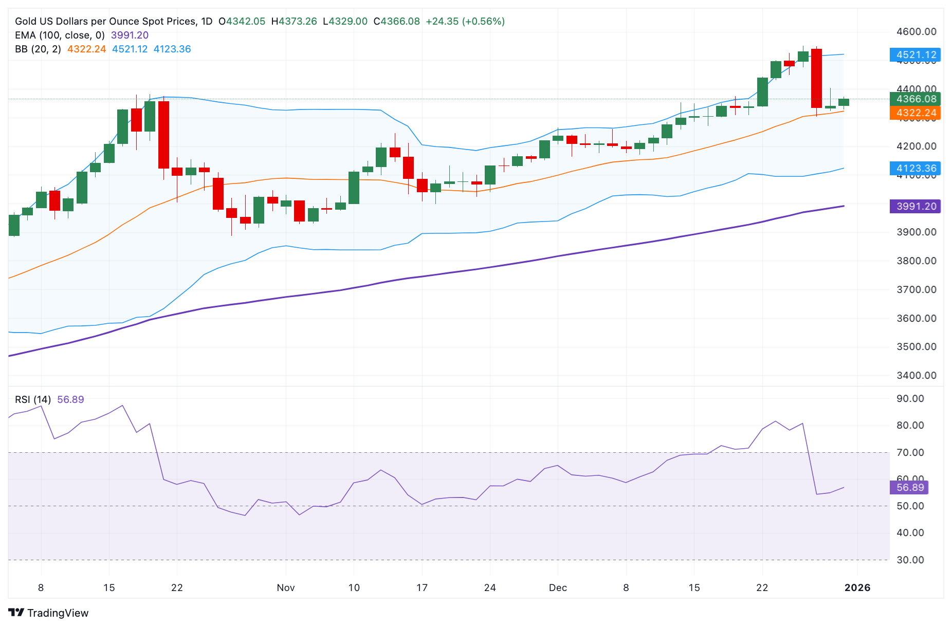 Giá vàng (XAU/USD) kéo dài đà tăng trên 4.350$ trong giờ giao dịch đầu tiên ở châu Âu vào thứ Tư. Giá vàng đã tăng khoảng 65% trong năm nay và dự kiến sẽ ghi nhận mức tăng hàng năm lớn nhất kể từ năm 1979. Đà tăng của kim loại quý được củng cố bởi triển vọng cắt giảm lãi suất của Mỹ trong năm 2026. Lãi suất thấp hơn có thể giảm chi phí cơ hội của việc nắm giữ Vàng, hỗ trợ cho kim loại quý không sinh lãi.