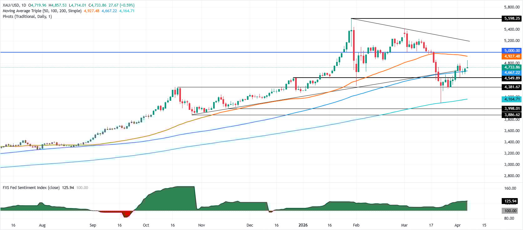 Bức tranh kỹ thuật cho thấy giá vàng vẫn duy trì xu hướng tăng, nhưng nếu không đóng cửa trên đường trung bình động giản đơn (SMA) 50 ngày ở mức 4.779$ trên biểu đồ hàng ngày sẽ mở ra khả năng thoái lui sâu hơn dưới SMA 20 ngày tại 4.723$.