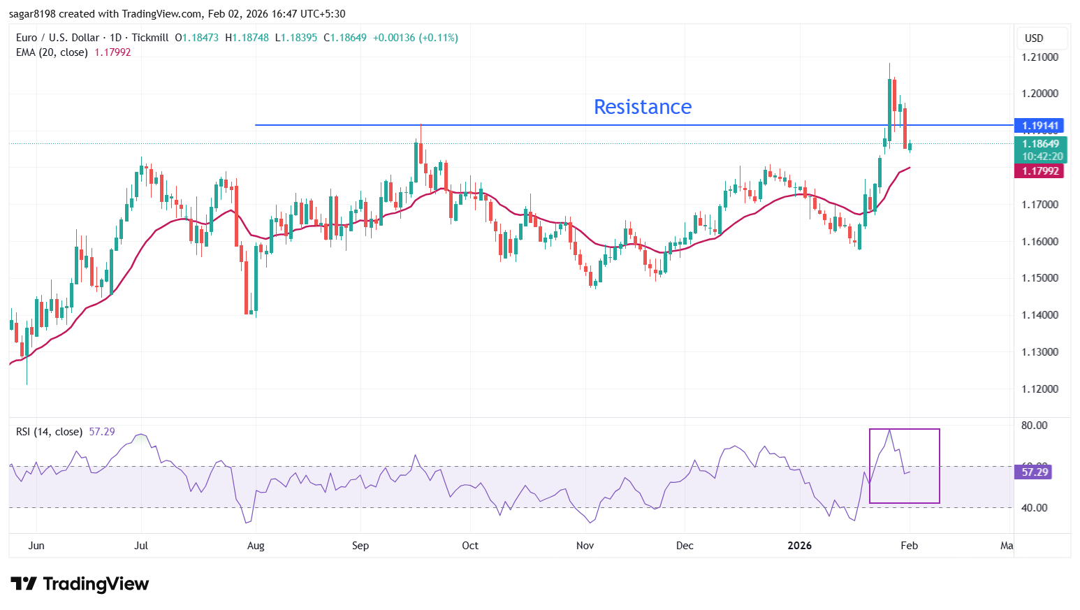 EUR/USD giao dịch tăng nhẹ lên gần 1,1865 tại thời điểm viết bài. Cặp tiền tệ chính giữ trên đường trung bình động hàm mũ 20 ngày (EMA), cho thấy xu hướng tăng vẫn còn nguyên vẹn.