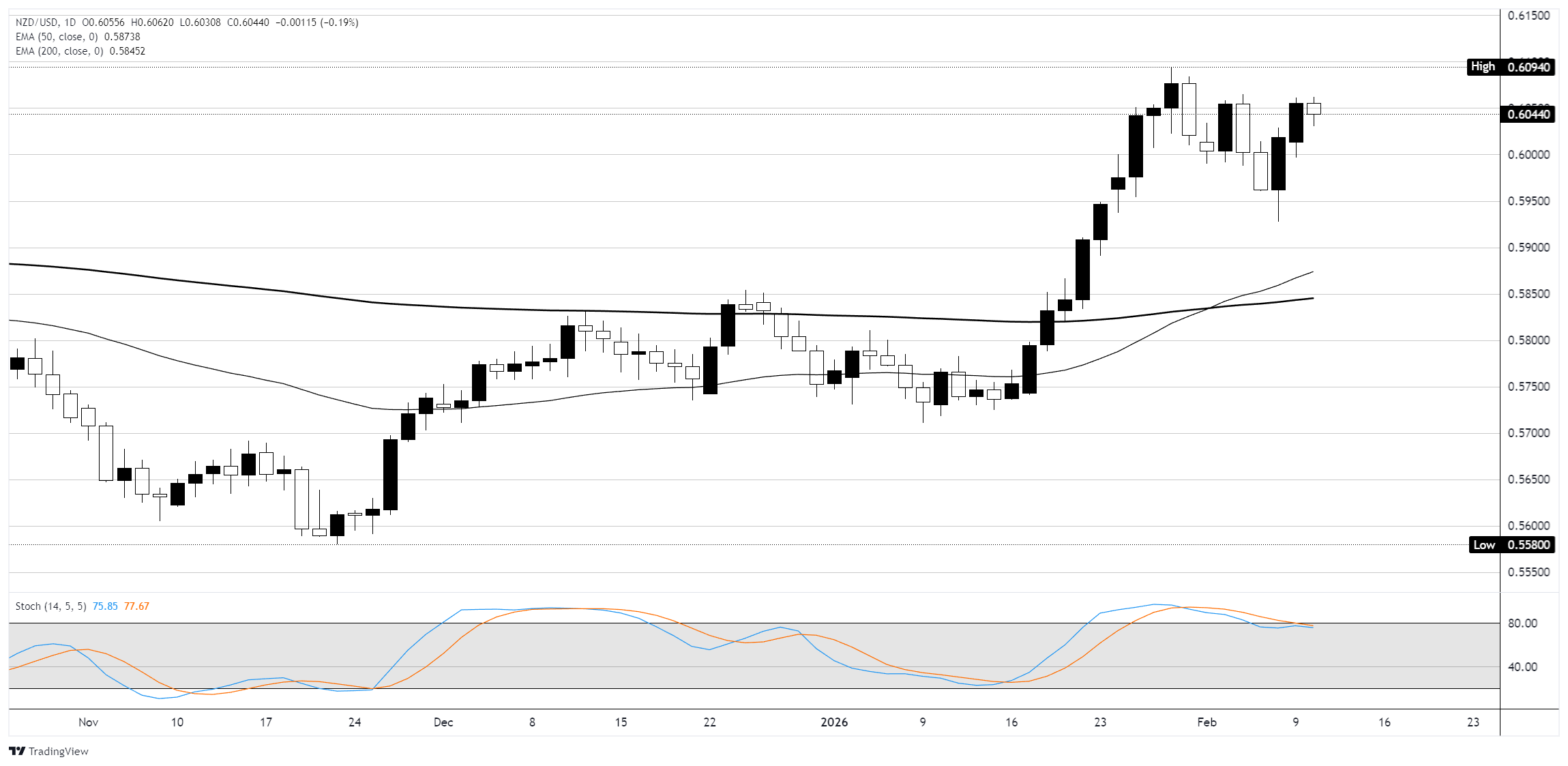 Đồng Đô la New Zealand đang giao dịch trong một xu hướng tăng rõ rệt trên biểu đồ ngày, với giá giữ vững trên cả đường trung bình động lũy thừa 50 (EMA) ở mức 0.5874 và đường EMA 200 ở mức 0.5845 sau một đợt tăng mạnh từ mức thấp cuối tháng 11 gần 0.5580. NZD/USD đã đạt đỉnh 0.6094 vào cuối tháng 1 trước khi bước vào giai đoạn tích lũy giữa khoảng 0.6000 và 0.6094 trong hai tuần qua, với phiên giao dịch hôm thứ Hai đóng cửa ở mức 0.6043, giảm 0.21% trong ngày.