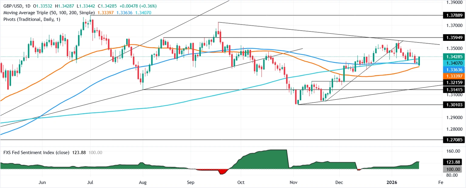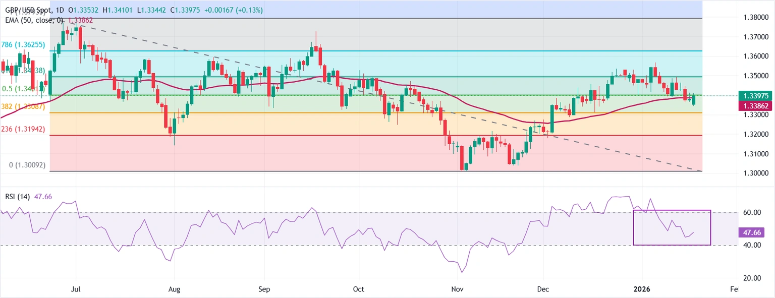 Cặp GBP/USD tăng lực kéo lên khoảng 1,3400 trong phiên giao dịch châu Á đầu ngày thứ Hai. Đồng đô la Mỹ (USD) suy yếu so với đồng bảng Anh (GBP) trong bối cảnh Tổng thống Mỹ Donald Trump đưa ra những đe dọa thuế quan mới đối với châu Âu liên quan đến Greenland. Thị trường Mỹ đóng cửa để kỷ niệm Ngày Martin Luther King Jr. vào thứ Hai. Đọc thêm...