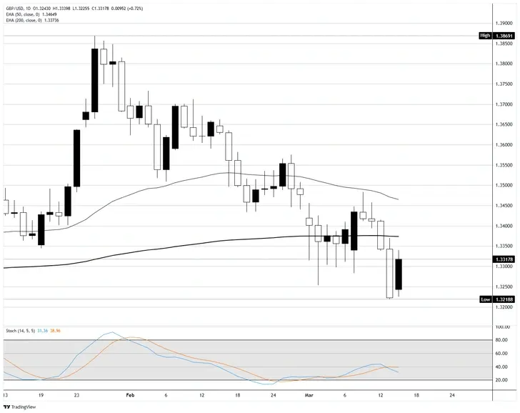 GBP/USD tăng gần 0,75% vào thứ Hai, bật lên từ mức thấp gần 1,3220 vào thứ Sáu để ổn định ở mức cao hơn 1,3300. Sự phục hồi trong phiên này có vẻ là điều chỉnh hơn là khởi đầu của một xu hướng mới; cặp tiền này vẫn trong xu hướng giảm rõ rệt từ mức cao cuối tháng Giêng gần 1,3870, và nến của thứ Hai vẫn chưa thách thức cụm kháng cự quanh đường trung bình động hàm mũ (EMA) 200 ngày. Giá đã đóng cửa dưới tất cả các đường trung bình động chính trong vài phiên, và gánh nặng chứng minh nằm ở phía người mua.