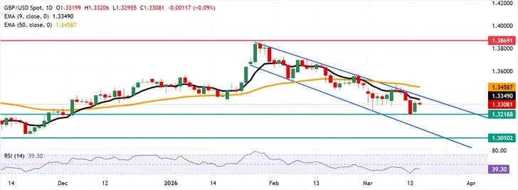 GBP/USD giảm nhẹ sau khi ghi nhận gần 0,75% mức tăng trong phiên trước, giao dịch quanh mức 1,3310 trong giờ châu Á vào thứ Ba. Xu hướng ngắn hạn vẫn hơi giảm khi giá giao dịch dưới đường trung bình động hàm mũ (EMA) 9 ngày đang giảm và hiện giao dịch dưới đường EMA 50 ngày phẳng, cho thấy động lực tăng đang suy yếu. Chuỗi các mức đóng cửa thấp gần đây từ khu vực 1,36 và sự thất bại trong việc lấy lại mức trung bình ngắn hạn xác nhận rằng các đợt tăng vẫn dễ bị tổn thương trước sự quan tâm giảm giá mới.