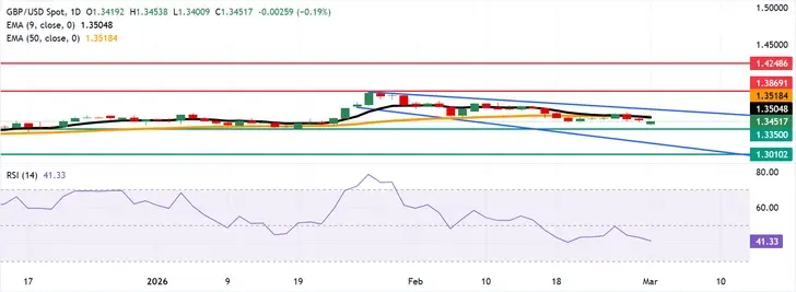 GBP/USD phục hồi từ mức giảm hàng ngày, giao dịch quanh mức 1,3450 trong giờ châu Á vào thứ Hai. Phân tích kỹ thuật của biểu đồ hàng ngày cho thấy xu hướng giảm giá đang diễn ra, khi cặp tiền này giao dịch trong một mô hình kênh giảm.