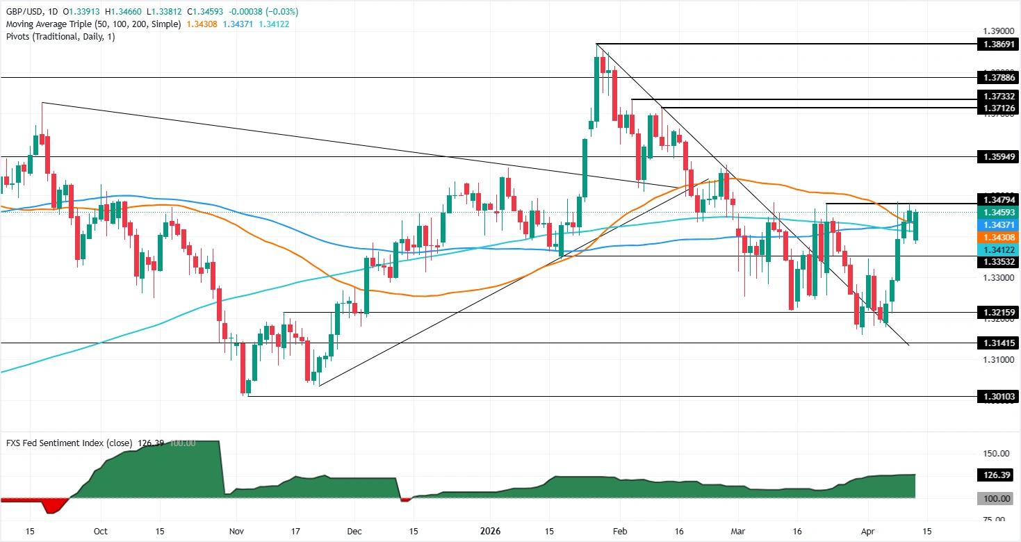 GBP/USD tăng vào thứ Sáu khi khẩu vị rủi ro cải thiện trước khi bắt đầu các cuộc đàm phán Mỹ-Iran tại Pakistan. Trong khi đó, lạm phát Mỹ tăng như dự kiến trong tháng Ba, nhưng các nhà giao dịch có vẻ tự tin đây chỉ là một cú nhảy một lần khi họ vẫn lạc quan về các cuộc đàm phán hòa bình Trung Đông. Tại thời điểm viết bài, cặp tiền này giao dịch ở mức 1,3461, tăng 0,20%. Đọc thêm...