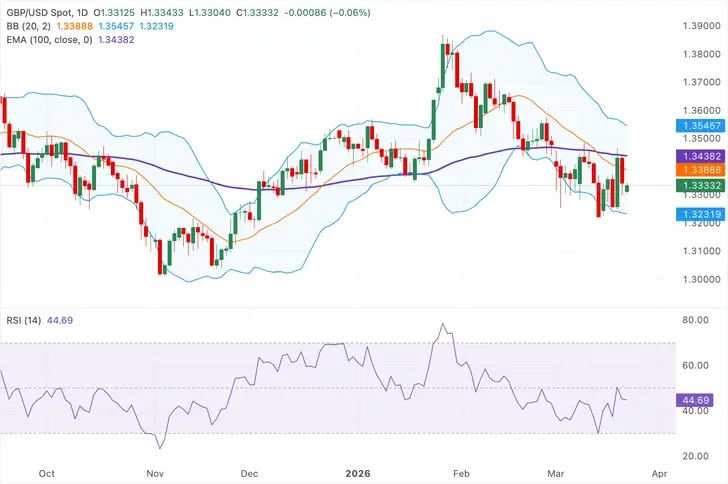 Cặp GBP/USD giữ mức giảm gần 1,3335 trong giờ giao dịch châu Á vào thứ Hai, chịu áp lực bởi đồng đô la Mỹ (USD) mạnh hơn. Cuộc xung đột leo thang ở Trung Đông đã đẩy giá dầu thô Brent vượt mức 100$ mỗi thùng. Điều này đã kích hoạt nỗi lo "lạm phát đình trệ" đối với Vương quốc Anh và gây áp lực lên cặp Cable so với USD.