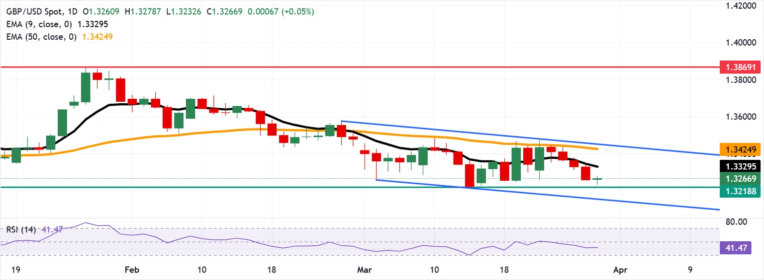 GBP/USD cao hơn vài inch sau bốn ngày giảm giá, giao dịch quanh mức 1,3270 trong giờ châu Á vào thứ Hai. Phân tích kỹ thuật trên biểu đồ hàng ngày cho thấy xu hướng giảm giá vẫn tồn tại, khi cặp tiền này duy trì trong mô hình kênh giảm dần. Đọc thêm...