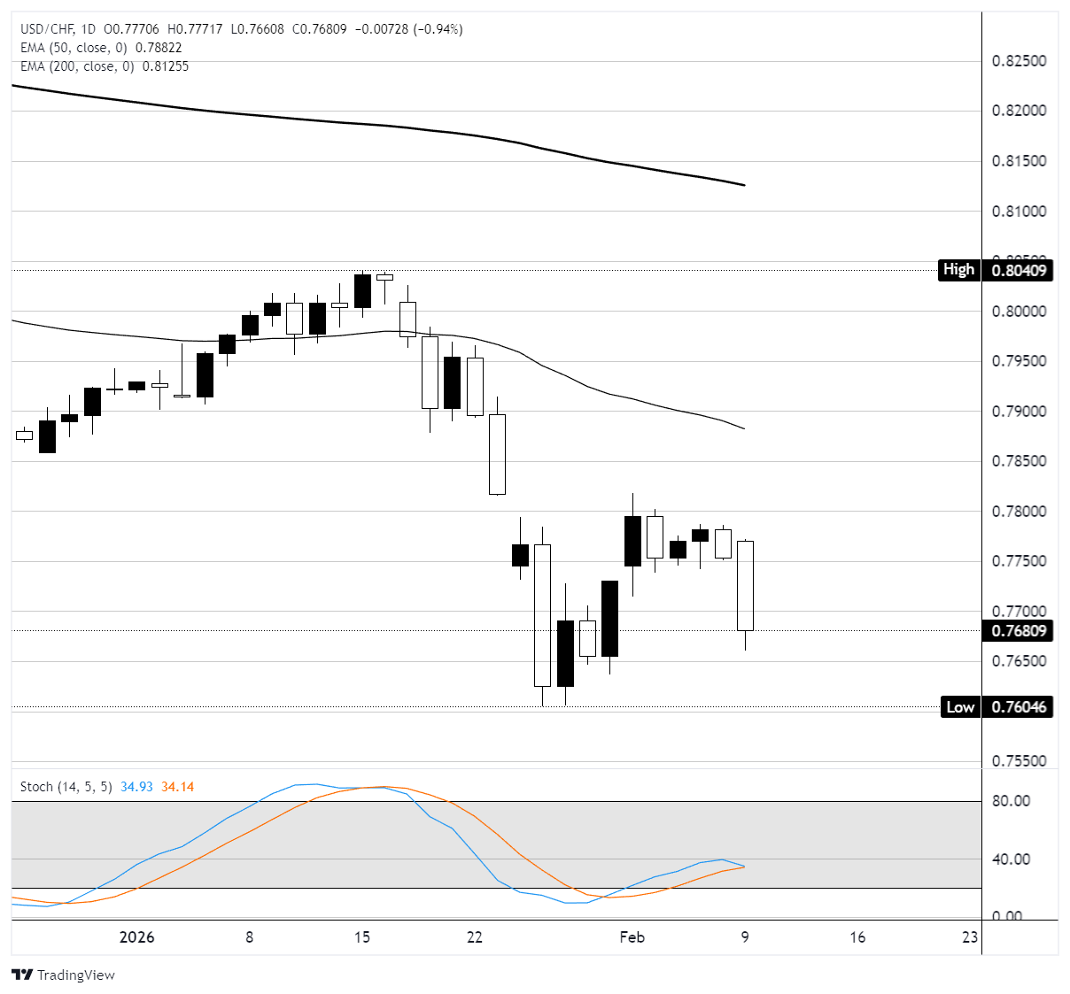 USD/CHF đang giữ xu hướng giảm vững chắc trên biểu đồ hàng ngày, ghi nhận các mức cao hơn và thấp hơn liên tiếp kể từ tháng 11 năm 2025 trong khi giao dịch dưới cả đường trung bình động hàm mũ (EMA) 50 ở mức 0,7882 và EMA 200 ở mức 0,8125. Cặp tiền này đã giảm mạnh từ khu vực 0,8000 vào giữa tháng 1, giảm qua ngưỡng 0,7800 để đạt mức thấp gần 0,7604 trước khi có một đợt phục hồi điều chỉnh. Sự phục hồi đó đã dừng lại quanh mức 0,7800, hình thành một cụm kháng cự nơi vùng hợp nhất trước đó và mức số tròn tâm lý hội tụ. Giá hiện đang giao dịch gần 0,7683 sau một nến giảm mạnh trong ngày, cho thấy người bán vẫn đang kiểm soát. Chỉ báo Stochastic Oscillator (14, 5, 5) trên khung thời gian hàng ngày đọc 35/34, đang quay xuống từ đường giữa mà không đạt đến vùng mua quá mức, điều này chỉ ra rằng đà tăng đang suy yếu trong xu hướng giảm rộng hơn.