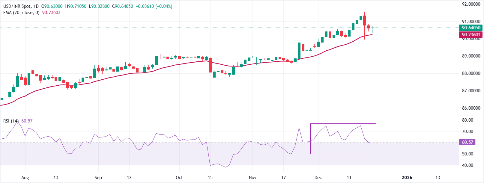 USD/INR phục hồi những khoản lỗ ban đầu và ổn định quanh mức 90,6405 vào thứ Sáu. Giá giữ trên Đường trung bình động hàm mũ (EMA) 20 ngày đang tăng tại 90,2360, điều này duy trì xu hướng tăng và cho thấy sự thoái lui nông.